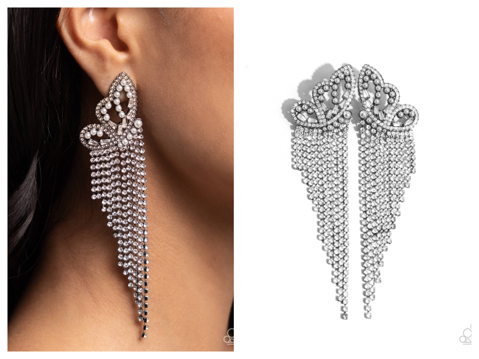 Glassy white rhinestones, dainty white pearls, and white emerald-cut gems are encrusted along the front of an airy gunmetal butterfly frame, creating a whimsical centerpiece. Staggered rows of white rhinestones pressed in delicate gunmetal square fittings cascade from the sparkly centerpiece, seemingly lifting the butterfly off to its glitzy flight. Earring attaches to a standard post fitting.