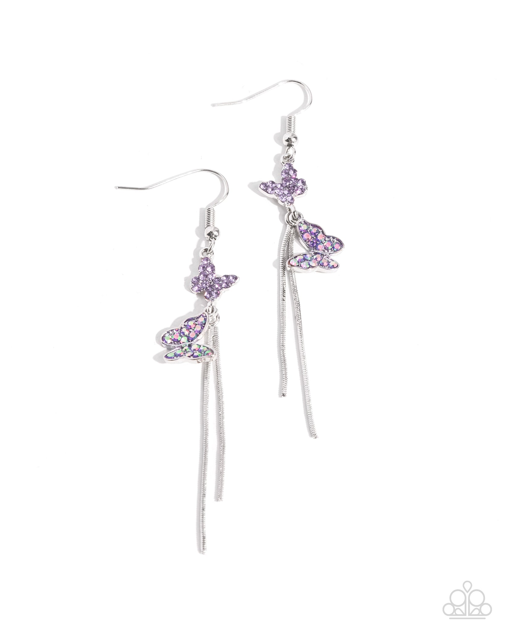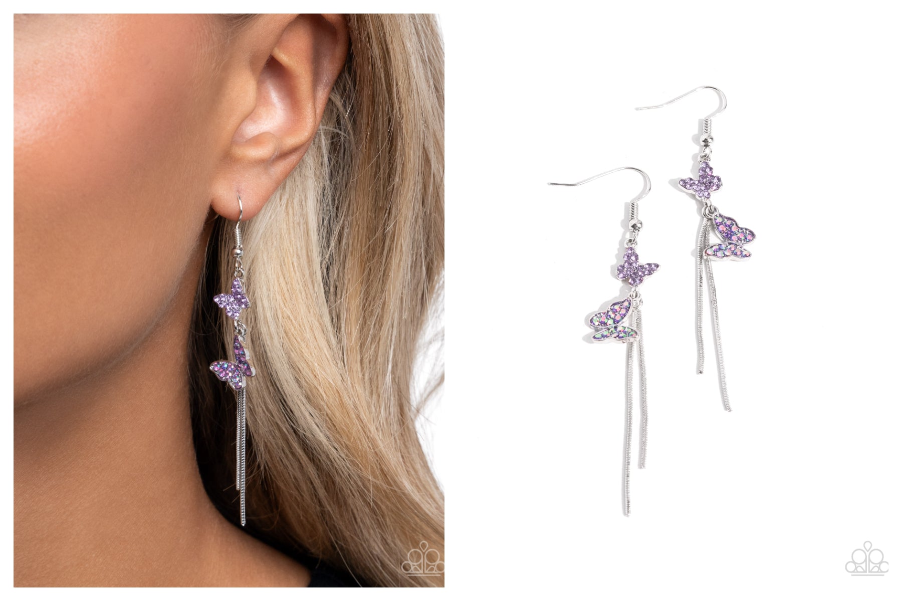Embellished in violet and iridescent violet rhinestones, a duo of silver butterflies cascades below the ear for a whimsically delightful flutter. Tapered strands of silver chain also cascade in between the two butterflies for additional eye-catching movement. Earring attaches to a standard fishhook fitting. Due to its prismatic palette, color may vary.