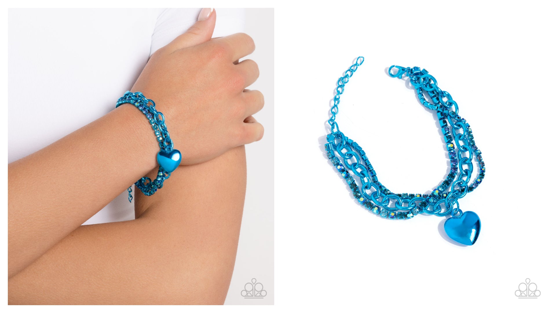 Dipped in a metallic blue hue, a collection of blue multicolored and iridescent rhinestones in square fittings, a larger gem strand of the same rhinestones, and a sleek curb chain twist around the wrist. A highly reflective metallic blue heart dangles from the curb chain strand for a heartfelt finish. Features an adjustable clasp closure. Due to its prismatic palette, color may vary.