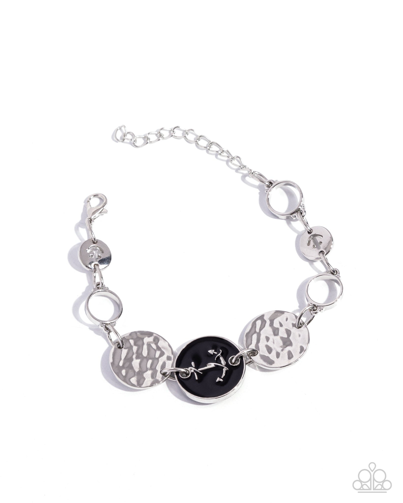 Gradually increasing in size, anchor-outlined silver discs, silver rings, delicately hammered silver discs, and a black-painted anchor embellished silver disc link around the wrist for a maritime flair. Features an adjustable clasp closure.