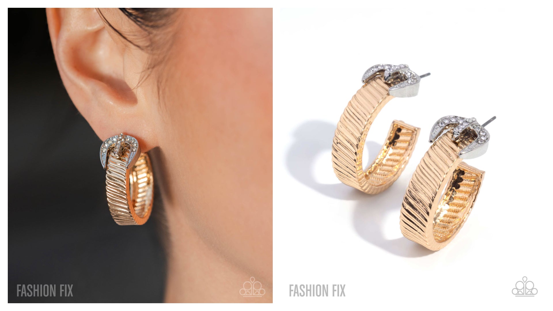 A glistening, gold linear-textured bar curls around the ear from an extended silver belt buckle-like post embellished in glistening white rhinestones, creating an edgy pop of shimmer below the ear. Earring attaches to a standard post fitting. Hoop measures approximately 1" in diameter.
