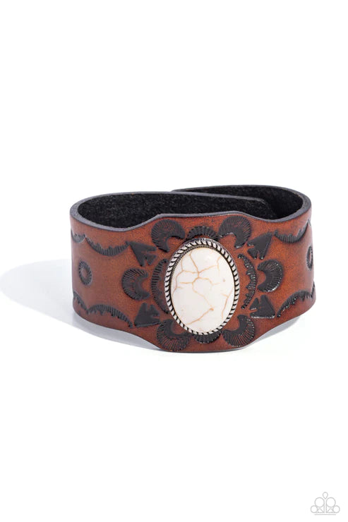 Bordered by silvery rope-like texture, an oval white stone is pressed into the center of a distressed brown leather band that is stamped in rustic desert inspired patterns, resulting in a rugged centerpiece around the wrist. Features an adjustable snap closure.