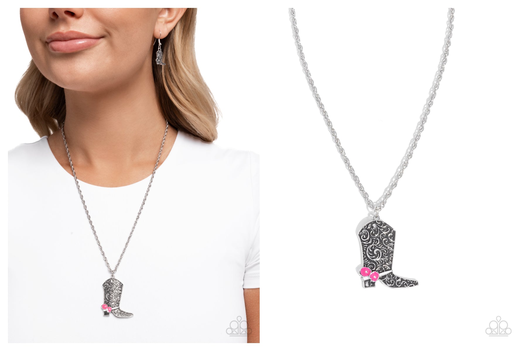 A textured cowboy boot pendant, engraved with intricate swirling patterns, swings from a classic silver chain. Adorned with a white-painted strap and playful pink-painted flower accents at the ankle, this charming design offers a touch of Western flair with a feminine twist. Features an adjustable clasp closure.