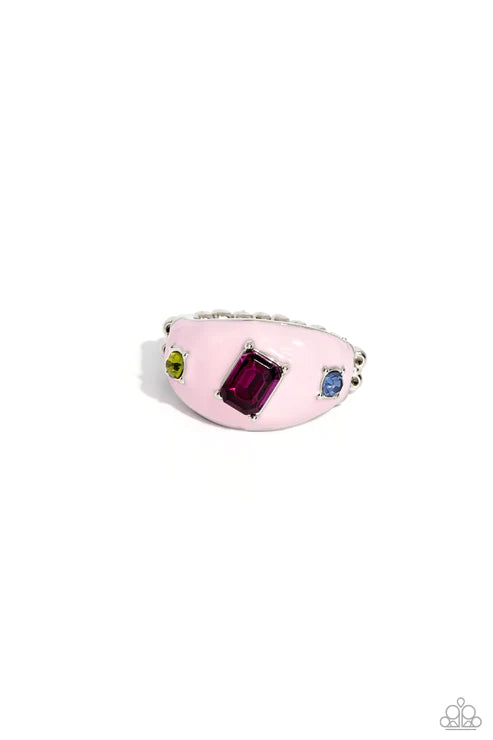 A thick band of silver, featuring a light pink hue, arcs across the top of the finger, creating an exaggerated rounded frame. An emerald-cut fuchsia gem and two round Kohlrabi and blue gems scatter across the surface for a blinding finish. Features a dainty stretchy band for a flexible fit.
