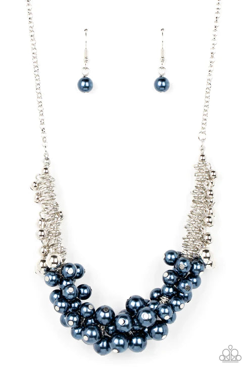 A bubbly cluster of blue pearls are bunched together between hanging silver beads that dangle between jampacked rows of silver rings, resulting in exaggerated effervescence below the collar. Features an adjustable clasp closure.
