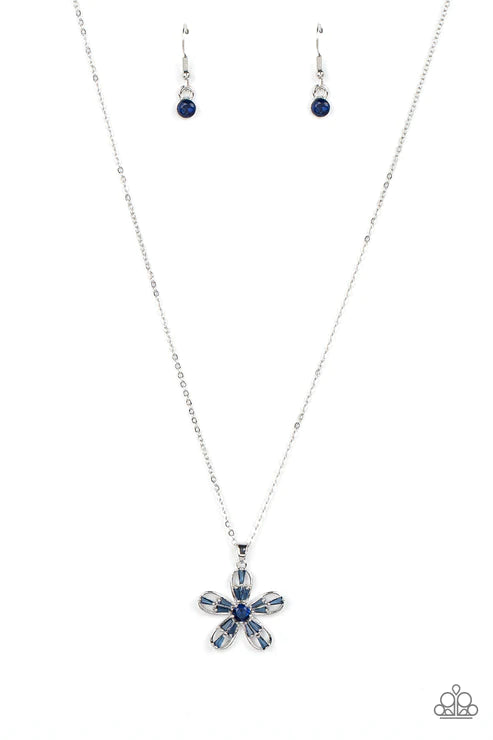 Emerald cut Skydiver rhinestones are scattered across the front of airy silver petals that bloom from a Skydiver rhinestone center, resulting in a sparkly floral pendant below the collar. Features an adjustable clasp closure.