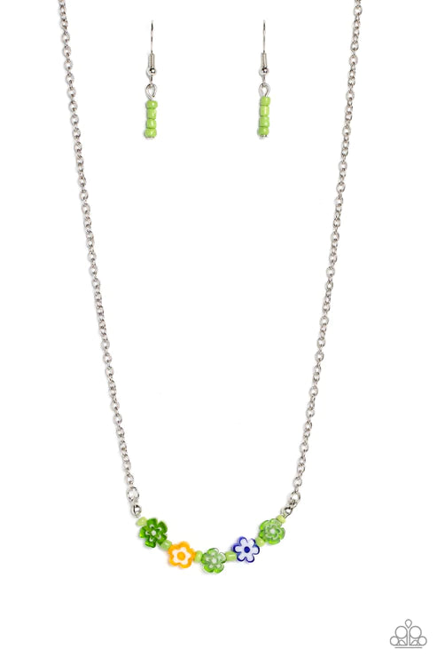 Infused at the bottom of a dainty silver chain, a row of flower beads in shades of green, yellow, and blue rest below the neckline. Separating each floral bead, green seed beads create additional pops of color against the seasonal flowers. Features an adjustable clasp closure.