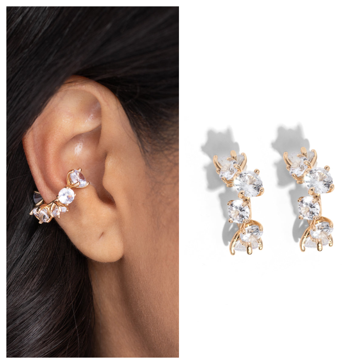 Fluttering atop pronged gold fittings, various faceted white gems glisten from the ear. Features a smooth surface for sliding ability to desired position on the ear. Due to its structure, adjusting capability is limited.