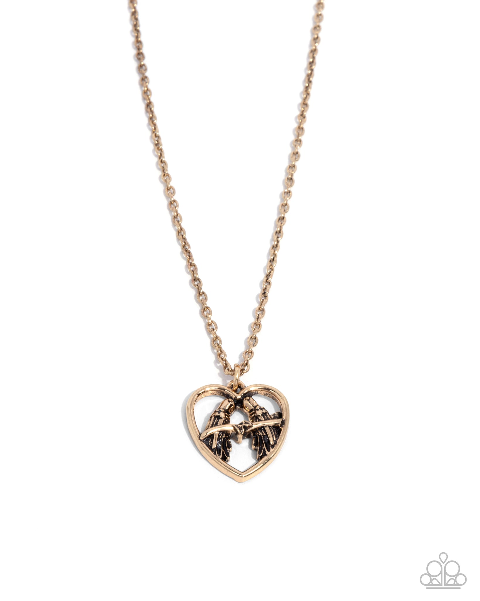 Perched atop a glistening gold branch that cuts across the middle of a sleek gold heart frame, a pair of textured gold birds meet at the curve of the heart frame along a dainty gold cable chain, creating an affectionately avian look. Features an adjustable clasp closure.