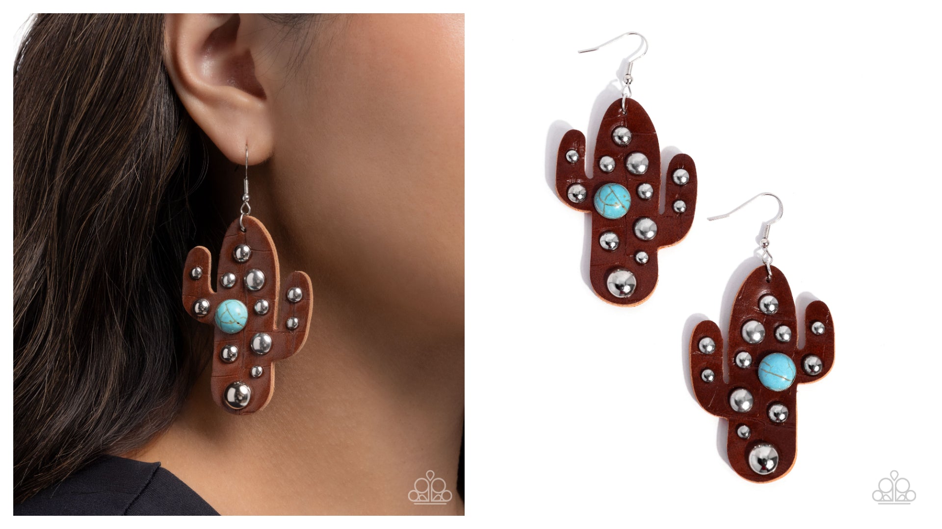 Featuring tactile silver studs in varying sizes and a solitaire turquoise stone, textured brown leather cactuses cascade from the ear for a Desert-inspired look. Earring attaches to a standard fishhook fitting. As the stone elements in this piece are natural, some color variation is normal.