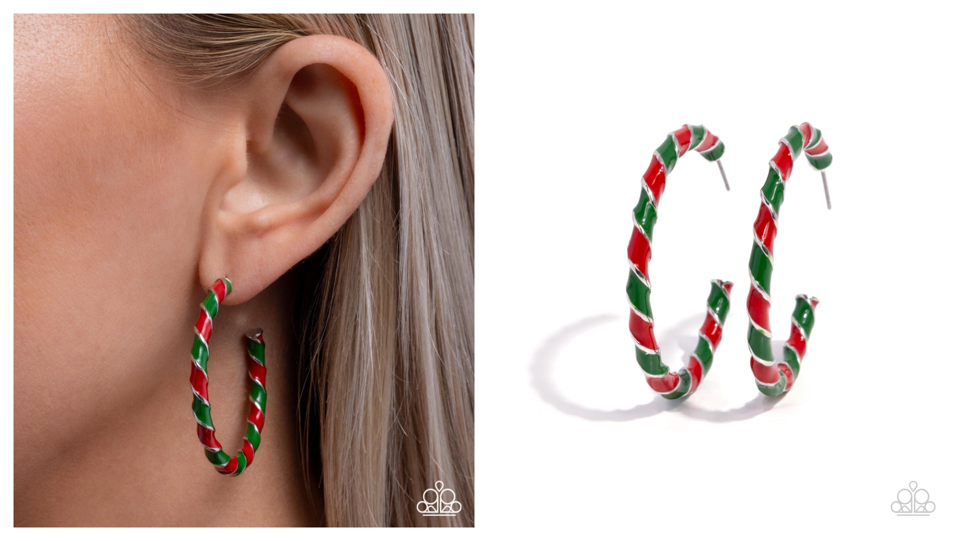 A simple silver hoop of silver curves around the ear featuring alternating stripes of red and green for a lasting Christmas-inspired impression. Earring attaches to a standard post fitting. Hoop measures approximately 1 3/4" in diameter.