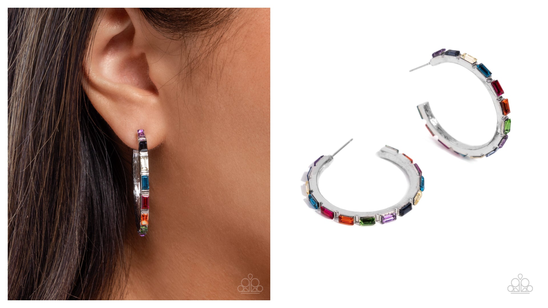 Pressed in elevated fittings, emerald-cut gems in multicolored finishes fall in line along a sleek bar of silver, creating a mesmerizing pop of color around the ear. Earring attaches to a standard post fitting. Hoop measures approximately 1 1/2" in diameter.