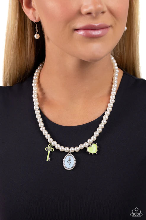 Infused along an invisible string, a collection of gleaming white pearls coalesces below the collar for a refined display. Featuring white rhinestones and dainty pearl accents, three Kohlrabi and blue painted charms, including a key, rose pendant, and studded heart, dangle below the pearly display for a girly pop of color. Features an adjustable clasp closure.