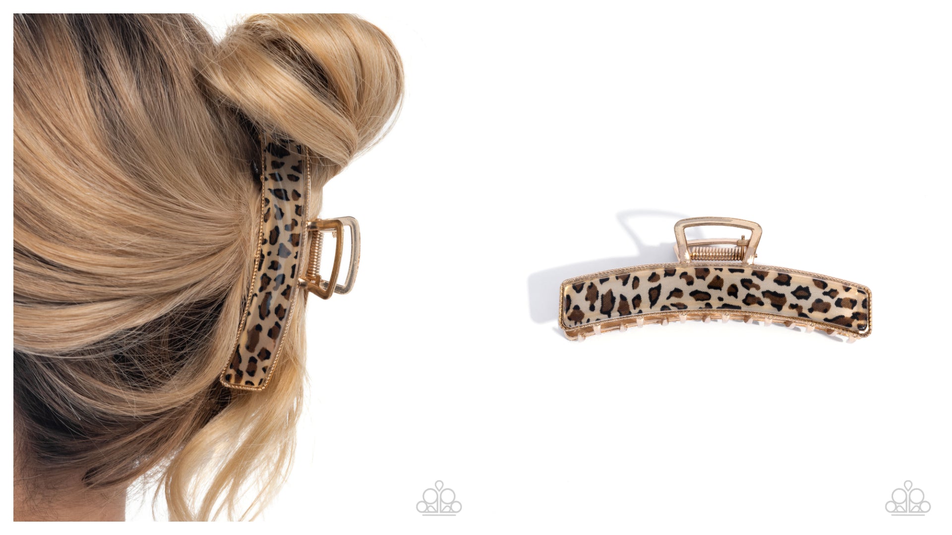 Featuring a cheetah-spotted motif, this refined gold claw clip holds the hair away from the face for an on-the-go fierce display. Clip measures approximately 4 1/2" in length and 2" in width.