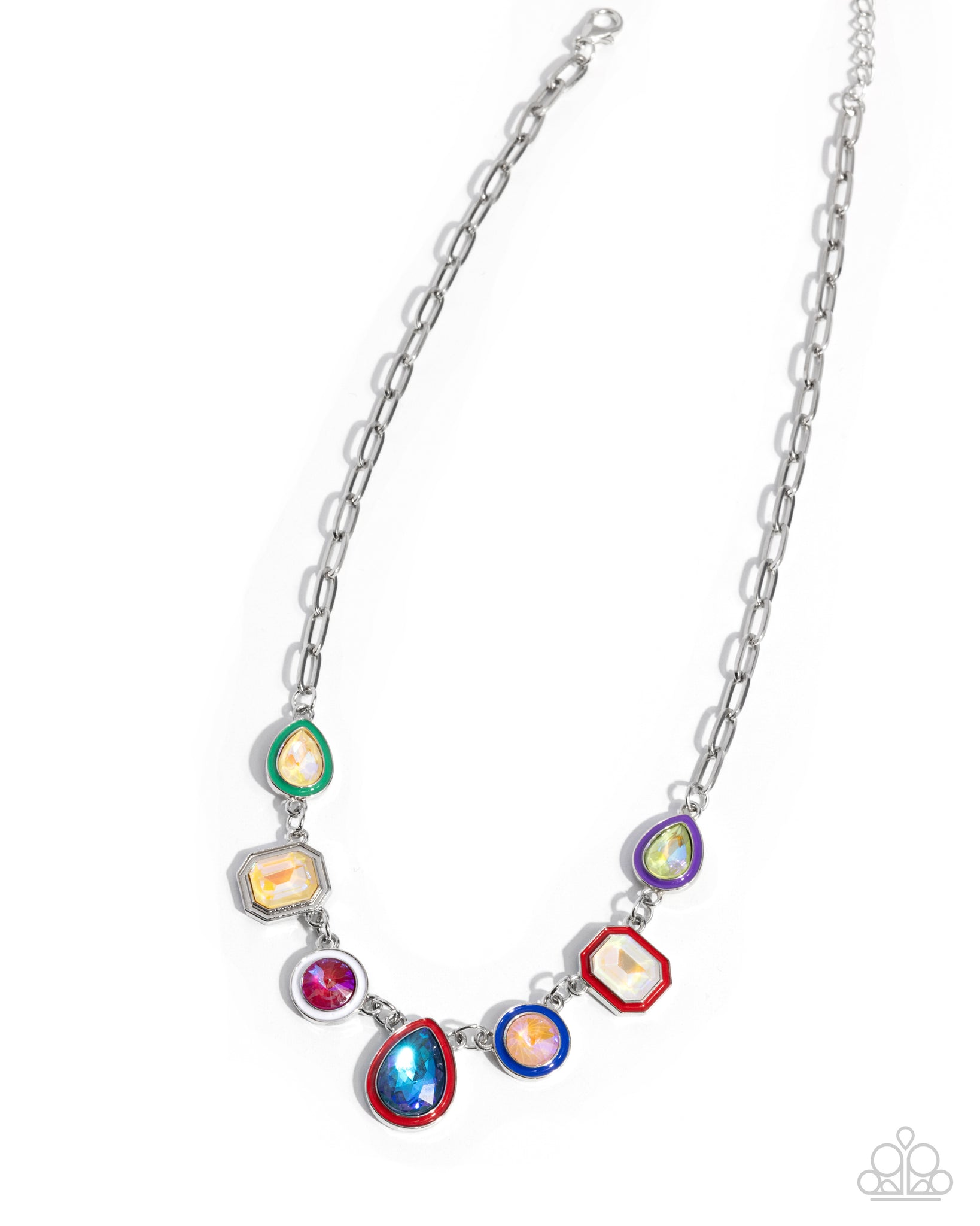 Attached to a section of shiny silver paperclip chain links, a collection of teardrop, emerald-cut, and round multicolored and UV shimmery gems, pressed in red, Royal Blue, emerald, purple, gray, and white-painted frames, swing below the collar for a fun-loving collision of color. Features an adjustable clasp closure.