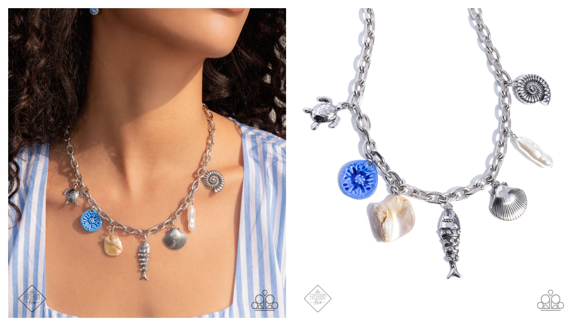 Swaying along a silver paperclip chain, a collection of coastal-inspired charms including a textured silver conch shell, a skinny baroque pearl, a silver seashell, a silver stud-detailed fish with a sapphire rhinestone eye and white rhinestone scales, an irregular oversized pearl, a blue-painted anemone-inspired disc, and a silver turtle draw attention below the neckline for an opulent oceanic display. Features an adjustable clasp closure.