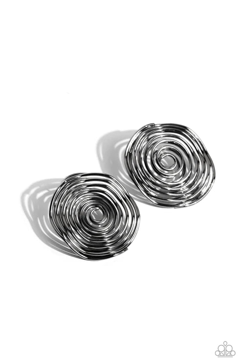 Glistening gunmetal bars delicately bend and coil into a springy spiral, creating a dizzying frame. Earring attaches to a standard post fitting.