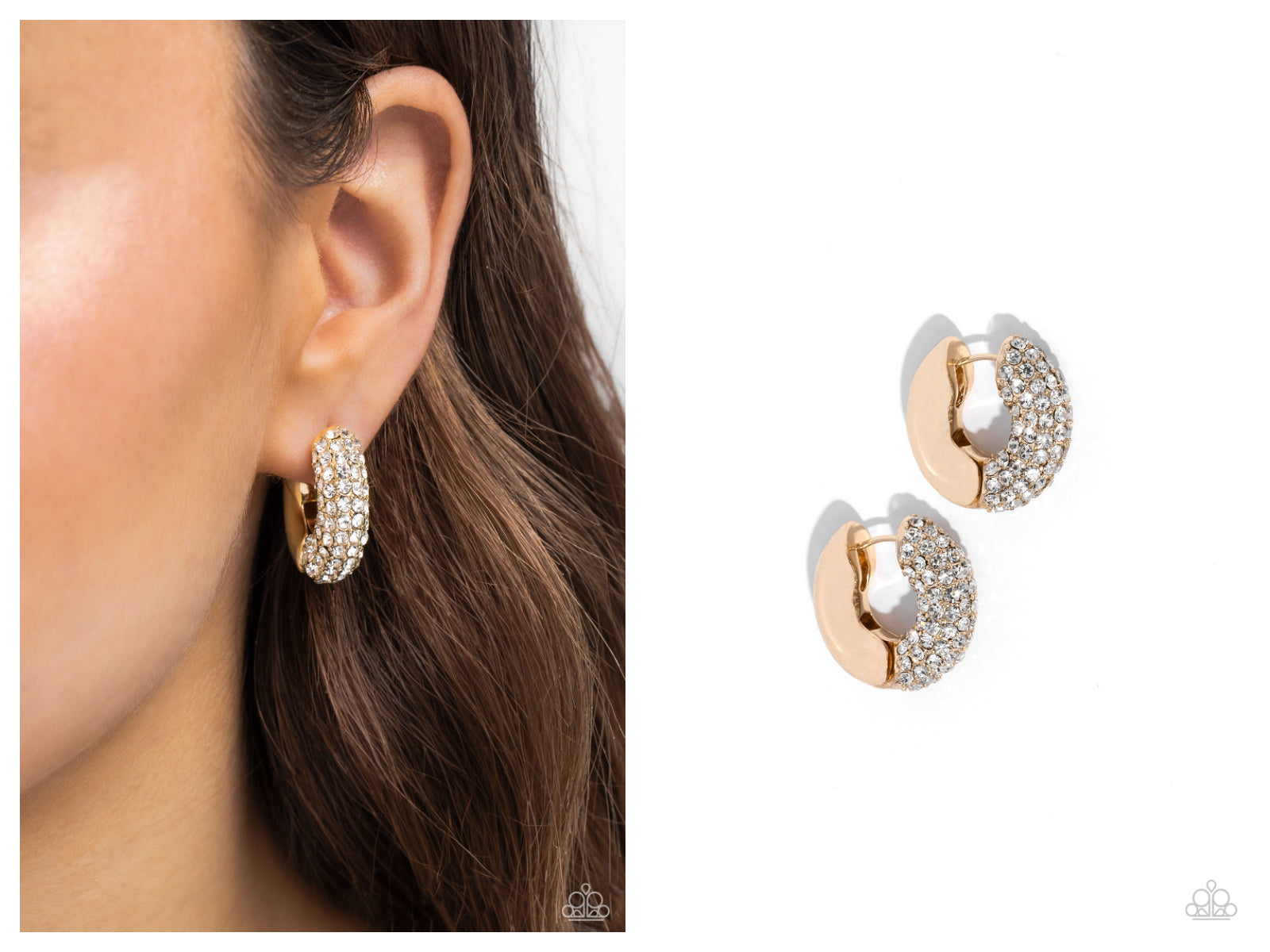Embellished with an explosion of glittering white rhinestones, gold hoops curl around the ear for a chic, combustible look. Earring attaches to a standard hinge closure fitting. Hoop measures approximately 3/4" in diameter.