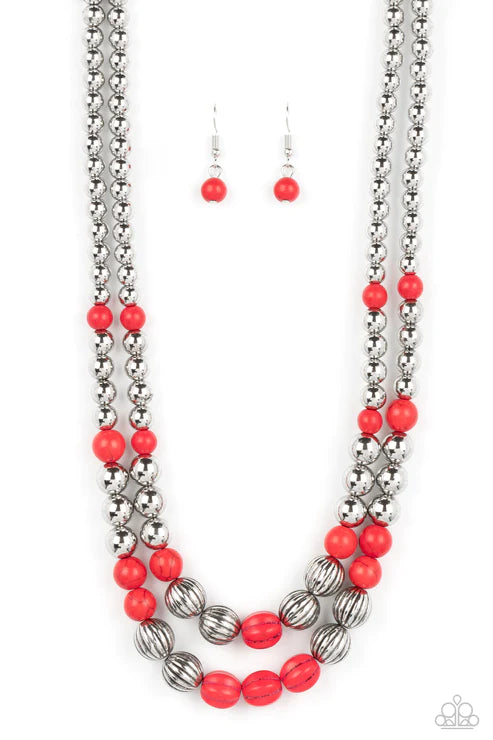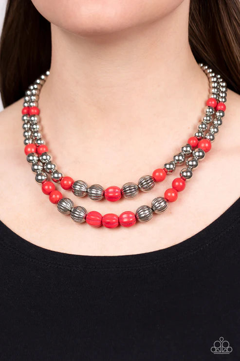 Gradually increasing in size, an earthy series of shiny silver beads, fiery red stones, and faux red stone accents are threaded along invisible wires below the collar, resulting in a rustic layered look. Features an adjustable clasp closure.