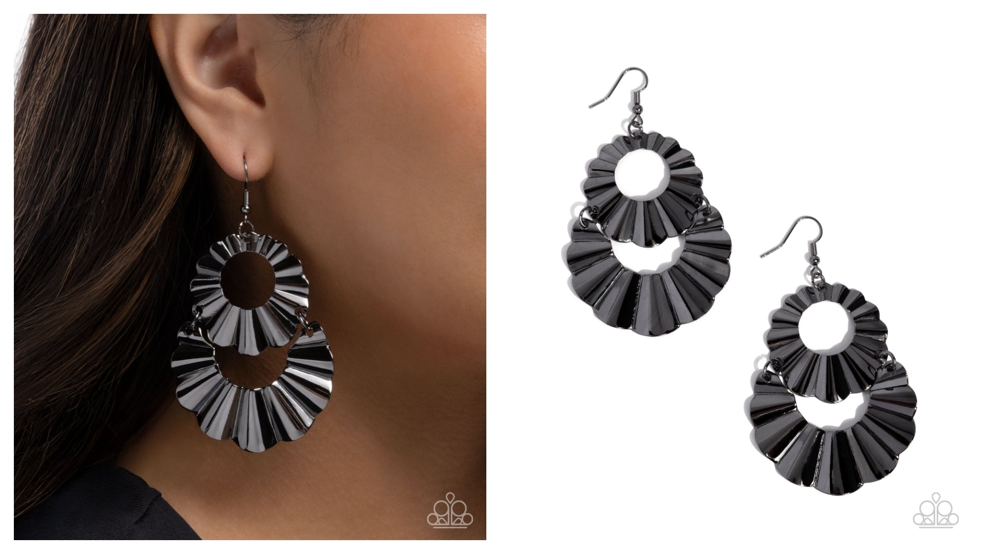 Oversized gunmetal circles with ridged, high-sheen surfaces ripple into a scalloped, sunburst-like pattern. Stacked into a tiered design, the lightweight frames sway with airy movement, reflecting light with every turn. The double-drop silhouette adds a dramatic dimension to any look. Earring attaches to a standard fishhook fitting.