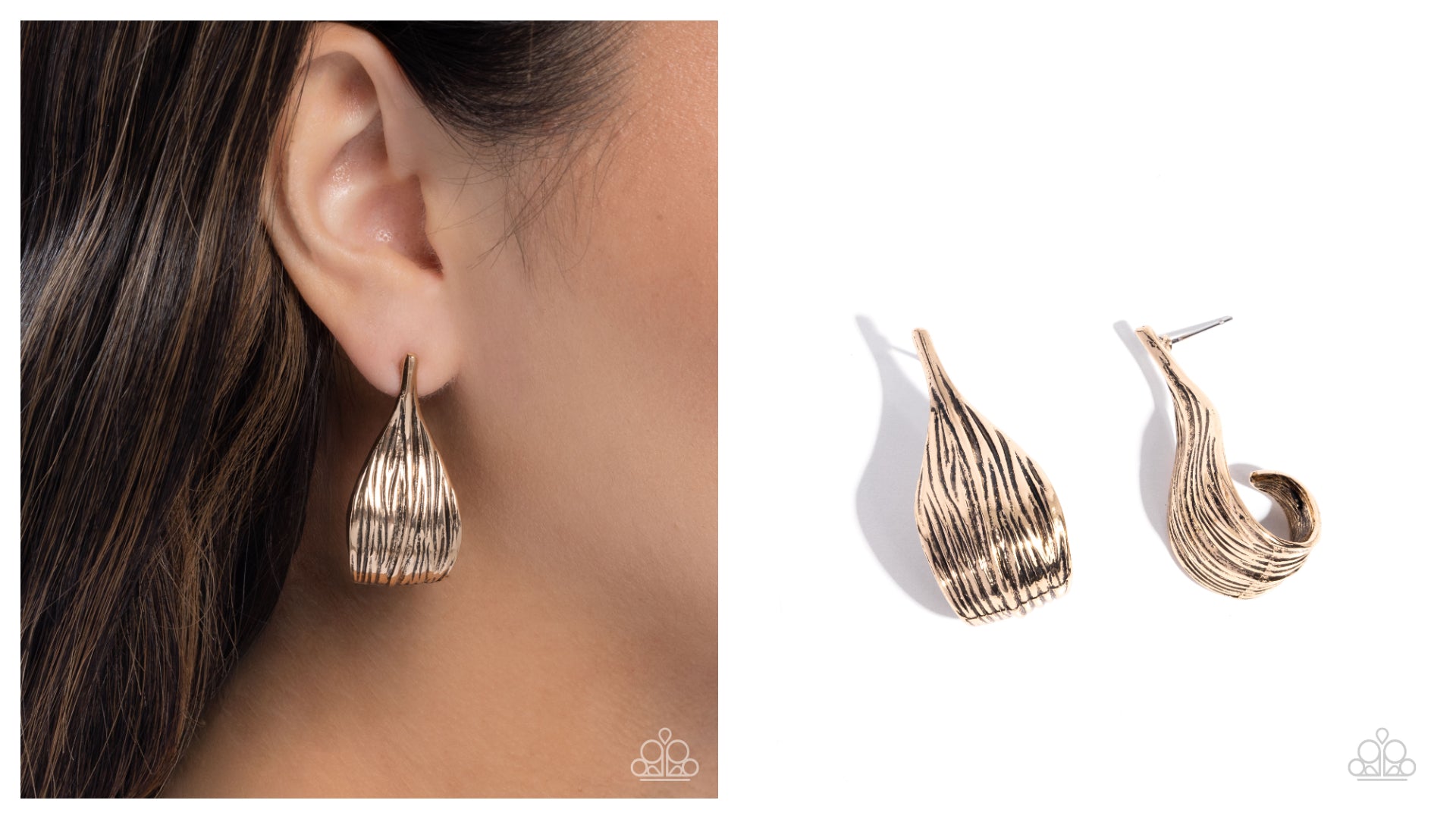 Brushed with texture, a gold flower petal curls below the ear for a radiant renewal of high-sheen springtime. Earring attaches to a standard post fitting.