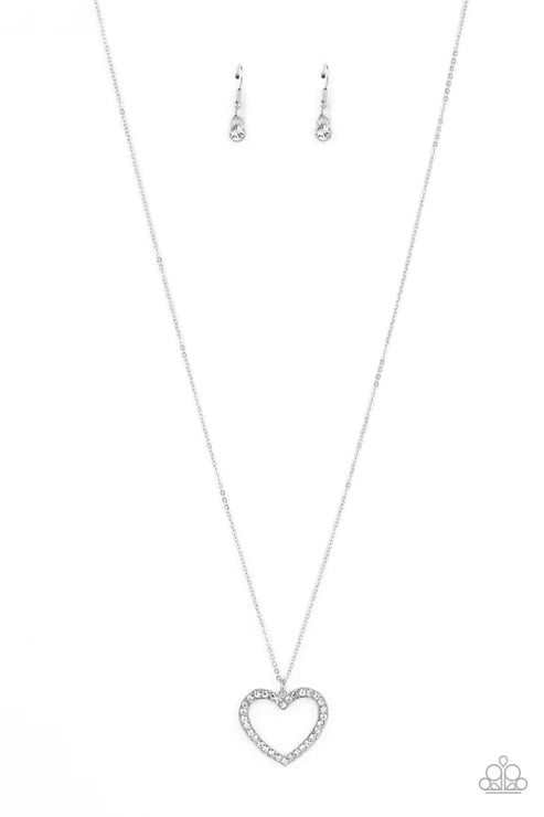 A silver heart-shaped silhouette is outlined with a border of white rhinestones and suspended from the bottom of a long silver chain. The glitzy rhinestones infuse the simple concept with irresistible sparkle, bringing a hint of glam to the charming design. Features an adjustable clasp closure.