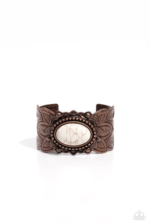 An oversized oval white stone is pressed into the center of a studded floral frame blooming atop a substantial copper cuff embossed in layers of tribal inspired details for an authentic look.