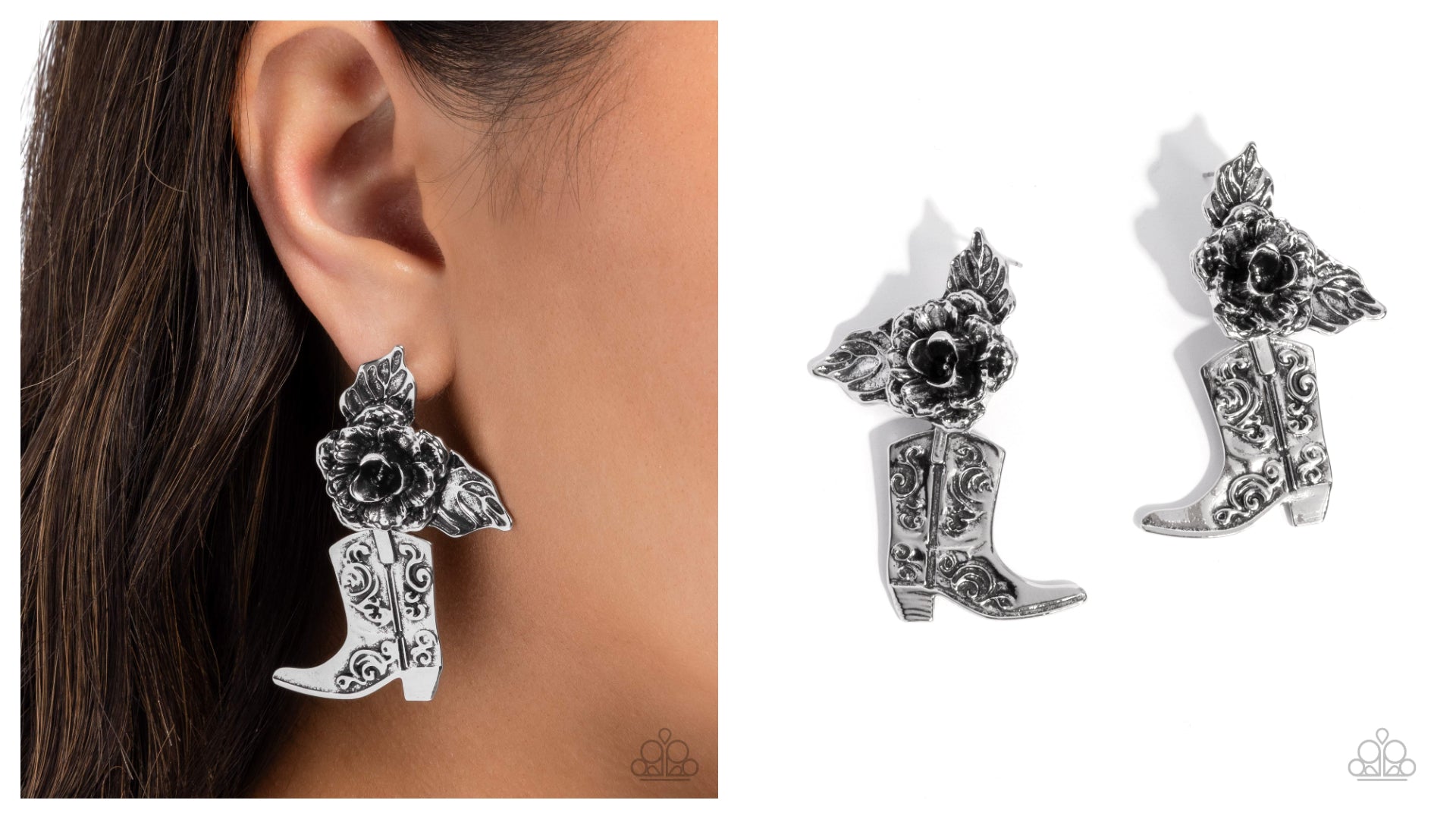 Featuring swirled silver embroidery, a pointed silver cowboy boot charismatically swing dances below the ear from a three-dimensional silver crimped rose complete with textured silver leaves for a whimsically Western lure. Earring attaches to a standard post fitting.
