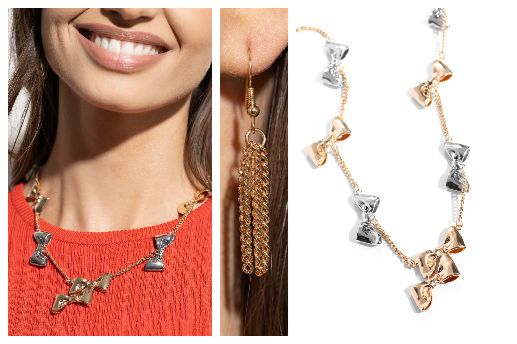 Connected along a classic gold chain, a collection of high-sheen, reflective silver and gold bows stand out along the neckline for a dazzling, dapper display. Features an adjustable clasp closure.