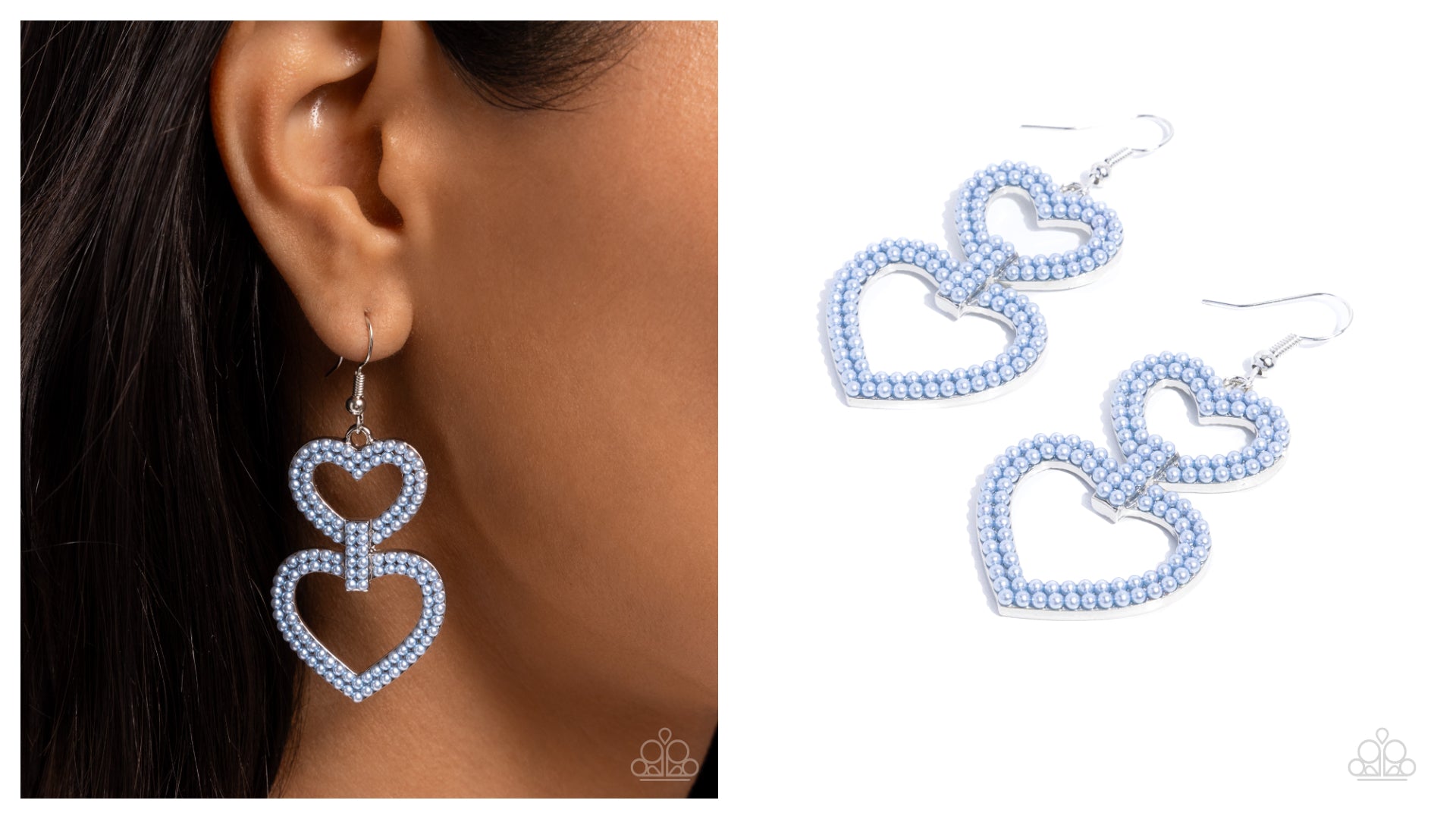 Pressed in interlocked silver heart frames of varying sizes and embellished atop the interlocking clasp itself, a doubled row of dainty Chambray Blue pearls glistens below the ear for a delightfully darling look. Earring attaches to a standard fishhook fitting.