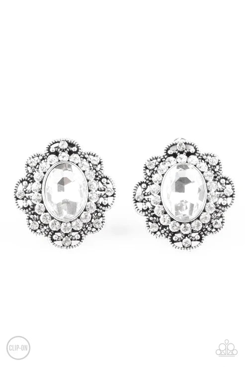 Dotted silver filigree spins into a frilly frame. A ring of radiant white rhinestones spins around a dramatic white gem center for a glamorous look. Earring attaches to a standard clip-on fitting.