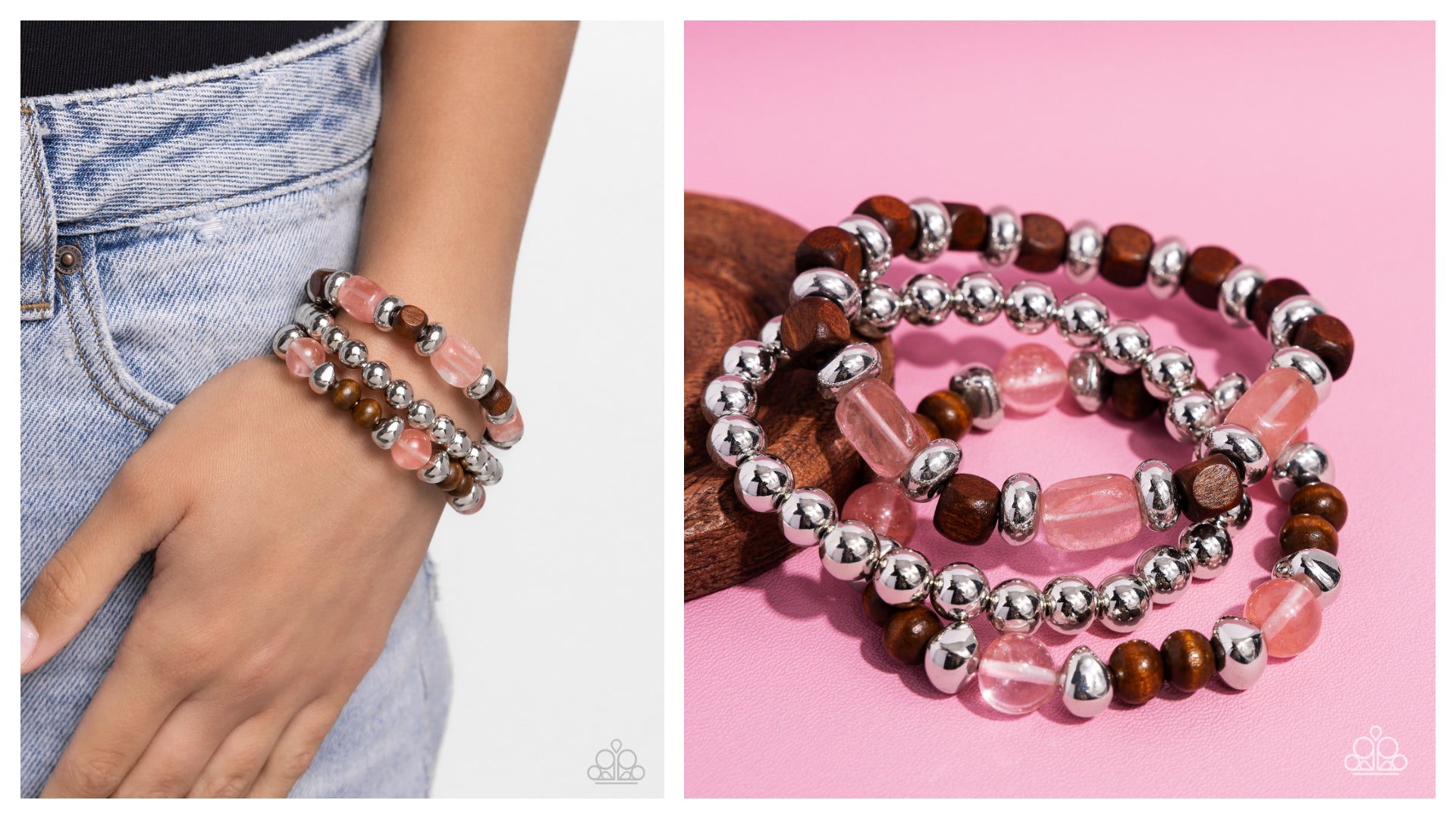 Infused along elastic stretchy bands, a collection of silver beads, wooden beads, and glassy pink stone beads stack up the wrist for a colorfully earthy look. As the stone elements in this piece are natural, some color variation is normal.
