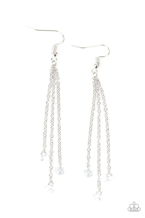 A trio of dainty white rhinestones sparkle like dewdrops as they dangle from the ends of dainty silver chains for a refreshingly divine lure. Earring attaches to a standard fishhook fitting.