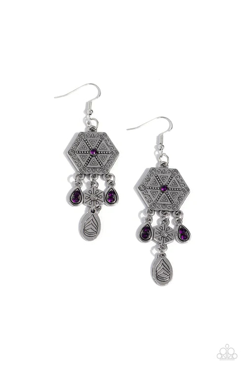 Studded and stamped in tribal inspired patterns, a stacked hexagon frame gives way to a mismatched assortment of purple rhinestones and ornate silver frames for a dreamcatcher-inspired result. Earring attaches to a standard fishhook fitting.