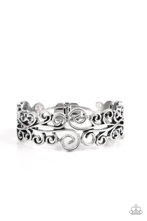 Frilly silver vine-like filigree scrolls around the wrist, coalescing into a whimsical bangle-like bracelet. Features a hinged closure.