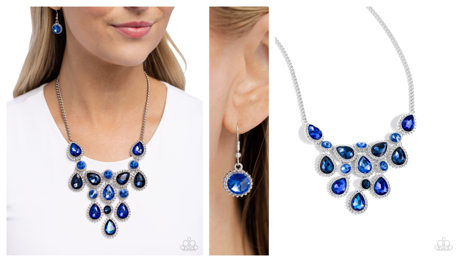 An explosion of round, teardrop, and marquise-cut gems in varying sizes bordered by tactile silver studs cluster together to create a glittery blue showcase down the neckline. Featuring various shades of blue, each gem reflects light off of its faceted surface emitting further glitz and glam. Features an adjustable clasp closure.