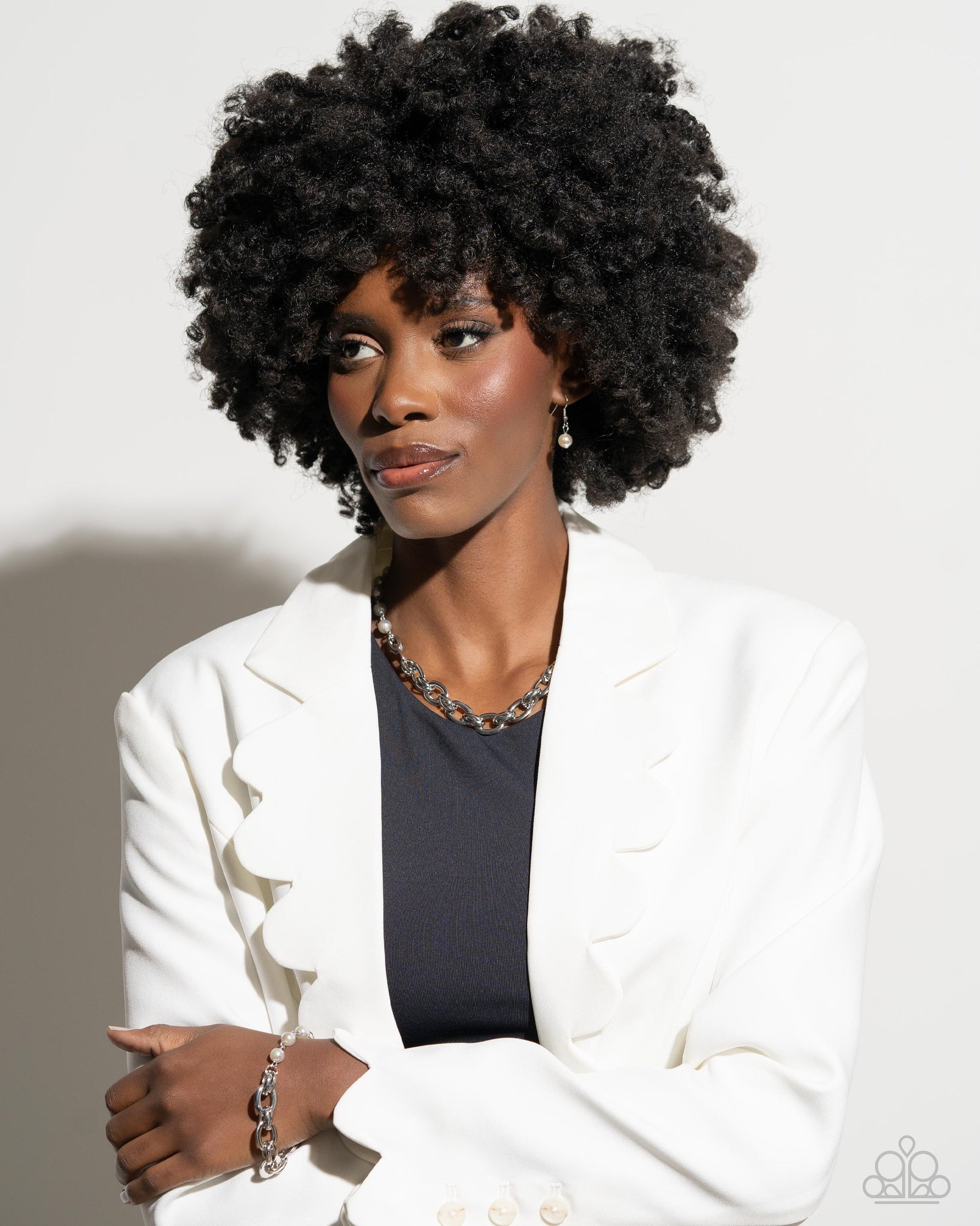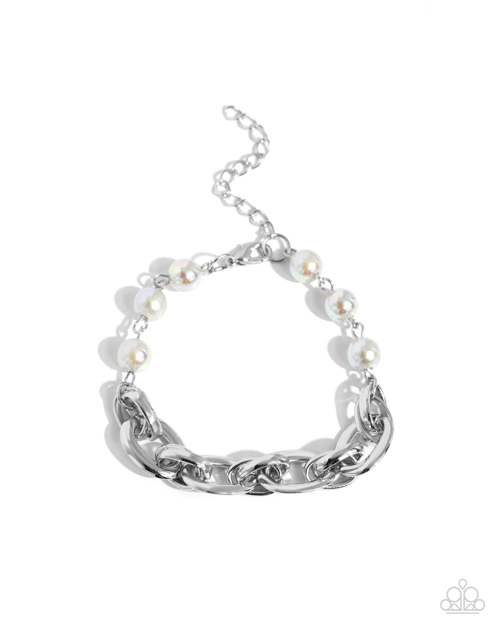 A strand of white pearls collides with a silver chain strand to create an abstract blend of grit and glitz. The oversized links of the chain offset the pearly sheen of the beads that lay on the opposite side, perfectly balancing the contrasting design. Features an adjustable clasp closure.