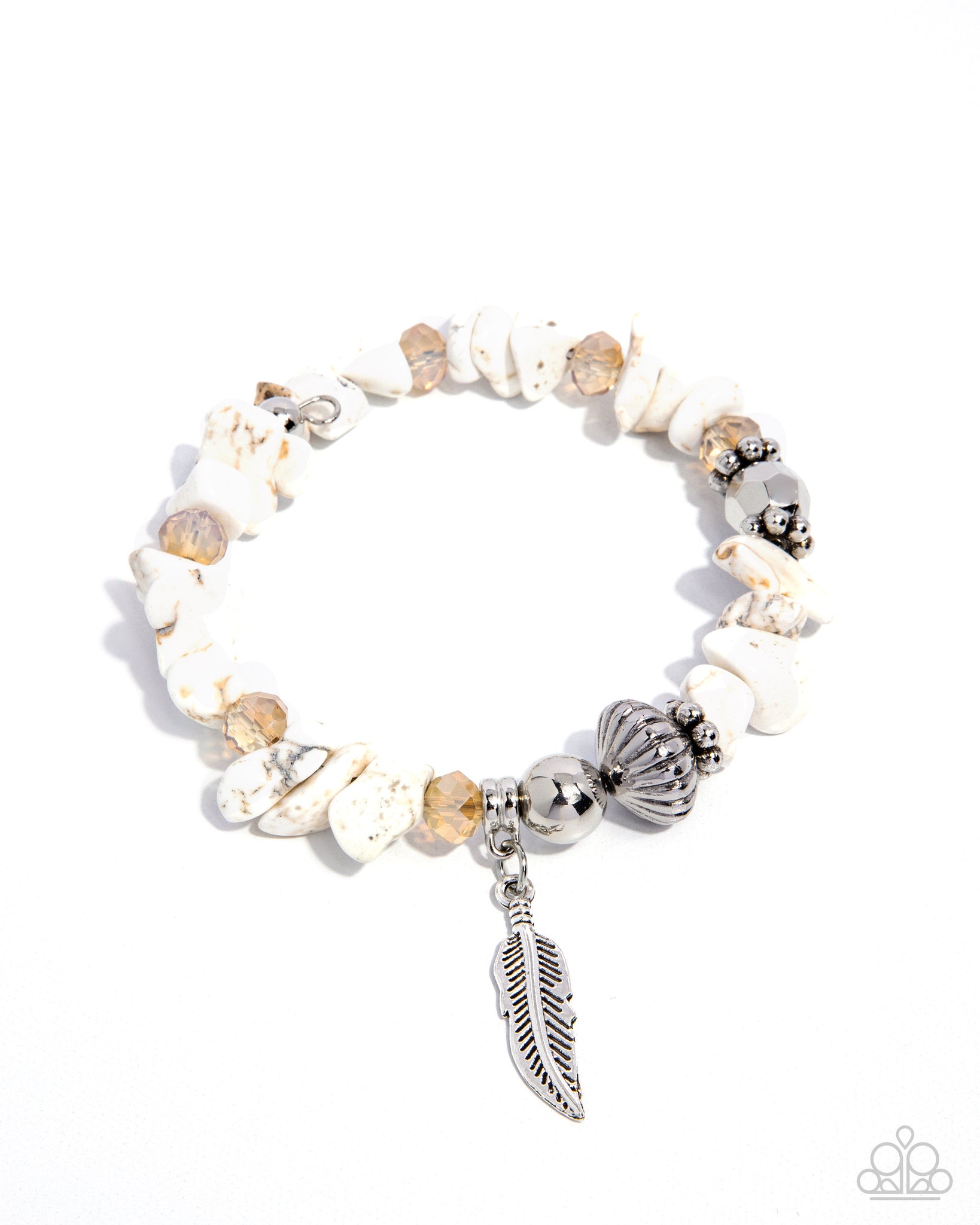 Threaded along a wire that coils around the wrist, a collection of chiseled white stones featuring brown marbling join various textured silver beads, and UV-splashed faceted peach beads, while a silver textured feather sways from the center of the display, creating a colorfully earthy infinity wrap-style bracelet. As the stone elements in this piece are natural, some color variation is normal.