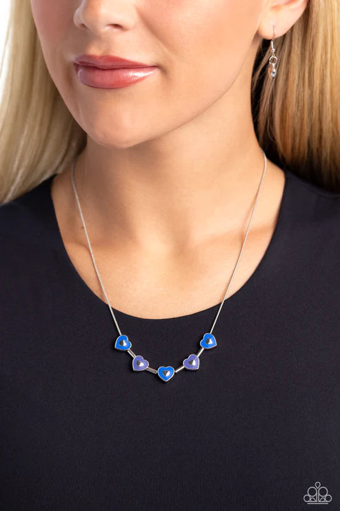 Strung along a dainty silver chain, a collection of silver heart frames, and silver bars alternate for a dainty display around the collar. Each heart is painted in a French Blue and Persian Jewel hue with dainty silver hearts glistening at their centers for a pop of colorful detail. Features an adjustable clasp closure.