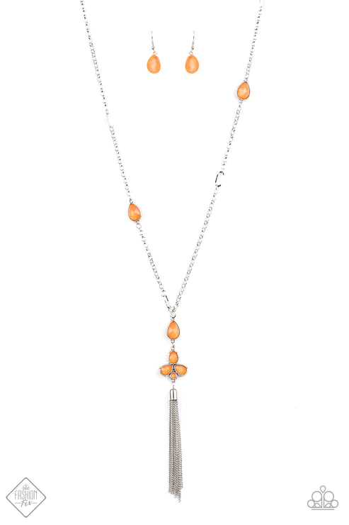 A cluster of dewy Orange Peel teardrop beads coalesces at the bottom of a lengthened silver chain. Matching beads embedded in airy silver frames dot the chains that climb the chest, bringing an extra pop of color to the vibrant design. A glistening silver tassel cascades from the bottom of the colorful pendant, creating ethereal movement. Features an adjustable clasp closure.