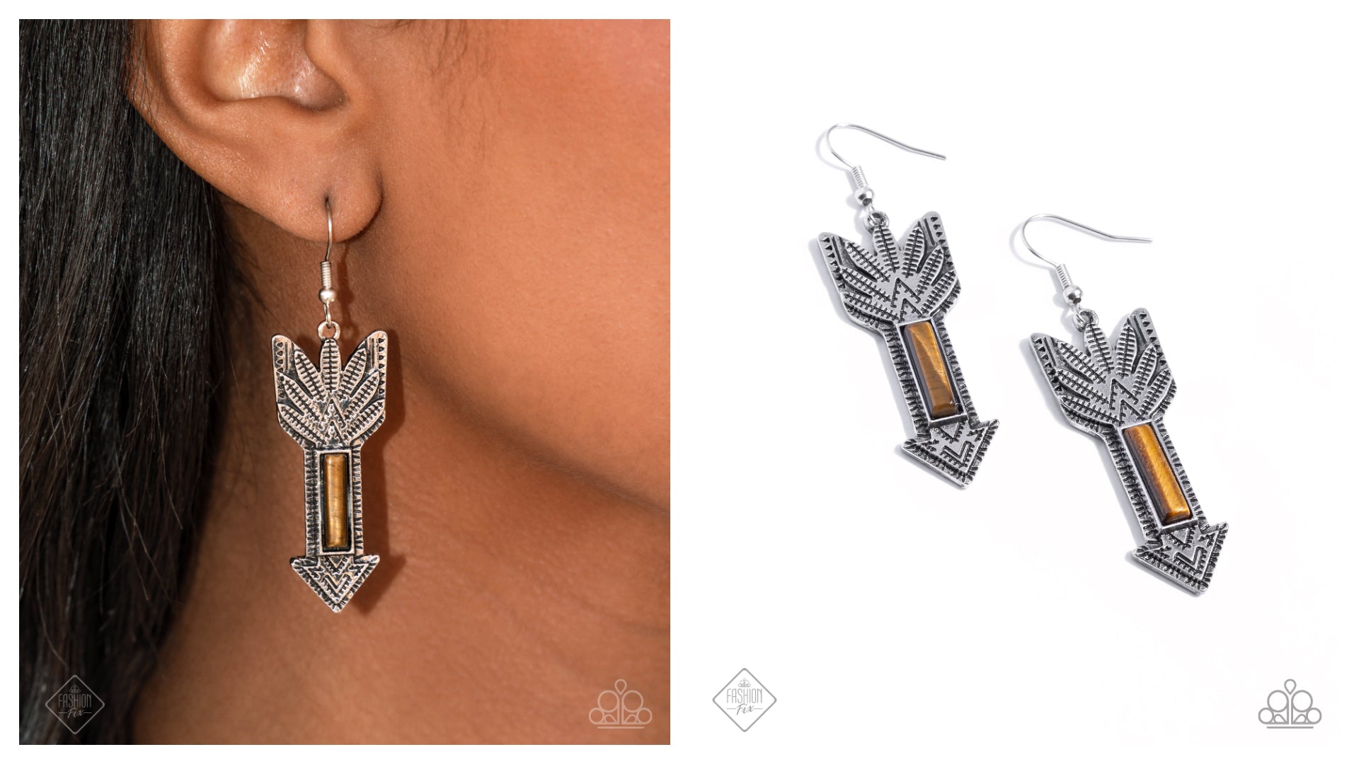 Pressed in an earthy motif-textured silver arrow, a rectangular-cut bar of tiger's eye stone glistens below the ear for an all-natural pop of color. Earring attaches to a standard fishhook fitting. As the stone elements in this piece are natural, some color variation is normal.