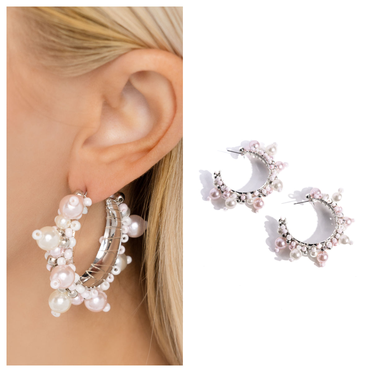 Threaded along a dainty silver wire, pearlized white and baby pink seed beads, silver beads, and white and baby pink pearls explode and wrap across the front of a classic silver hoop for an unexpected pop of shimmer. Hoop measures approximately 1 1/4" in diameter.