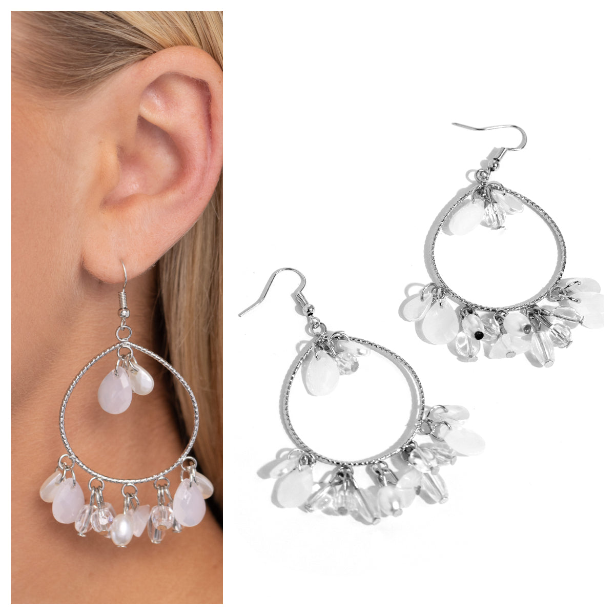 Opaque white teardrops, various clear beads, an opaque white chiseled acrylic piece, and oval and textured teardrop pearls dangle from the top and bottom of an oversized, textured silver teardrop frame, creating a glamorous fringe. Earring attaches to a standard fishhook fitting.