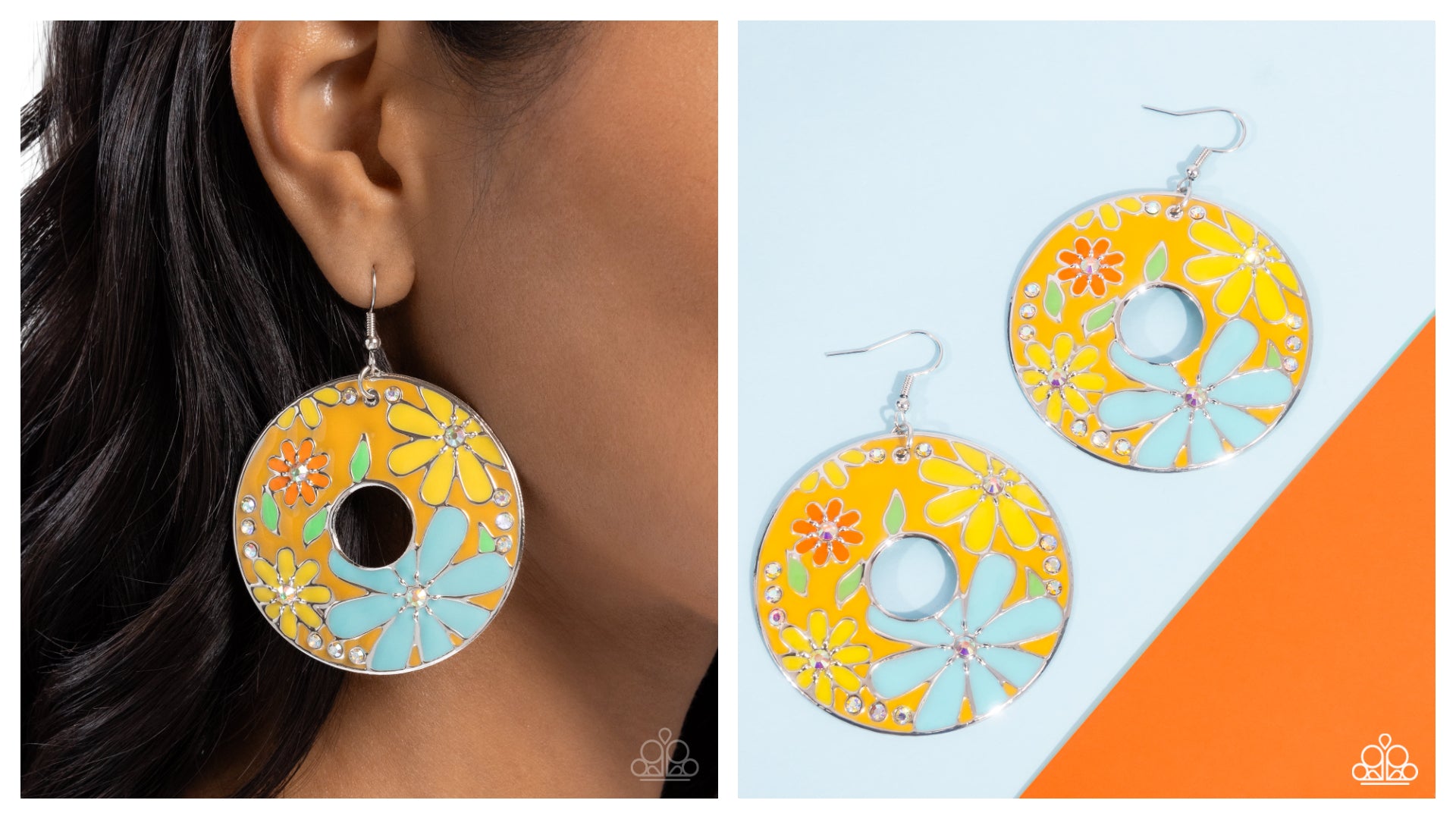 Featured atop a Saffron-painted silver wreath, a collection of Classic Green leaves, a large tiffany flower, a dainty orange flower, and Primrose flowers with iridescent and white rhinestone centers and details create an embroidery-inspired look below the ear. Earring attaches to a standard fishhook fitting. Due to its prismatic palette, color may vary.