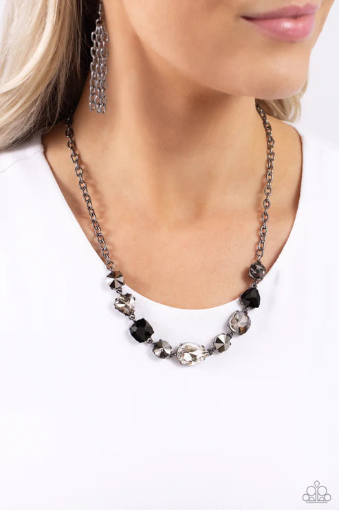 Set in gunmetal-pronged fittings, glittering geometric hematite, smoky, black, and white gem and acrylic shapes delicately coalesce around the collar on a sleek gunmetal chain for an edgy statement. Features an adjustable clasp closure.