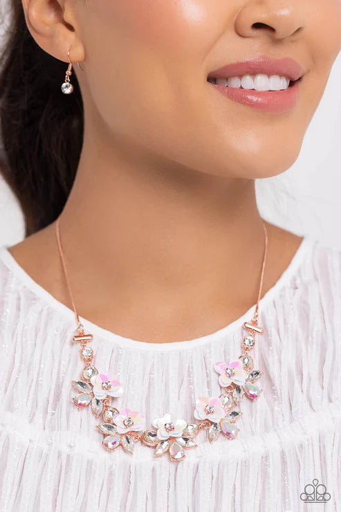 Pieces of shimmery, iridescent sequins fan out around sparkling white rhinestones to create three-dimensional flowers that bloom along the neckline. White marquise-cut gems and iridescent teardrops flare out behind each floral frame, adding irresistible sparkle to the design. Finally, white rhinestones separate each enchanting cluster, culminating in a dreamy display suspended from a dainty shiny copper snake chain. Features an adjustable clasp closure. Due to its prismatic palette, color may vary.