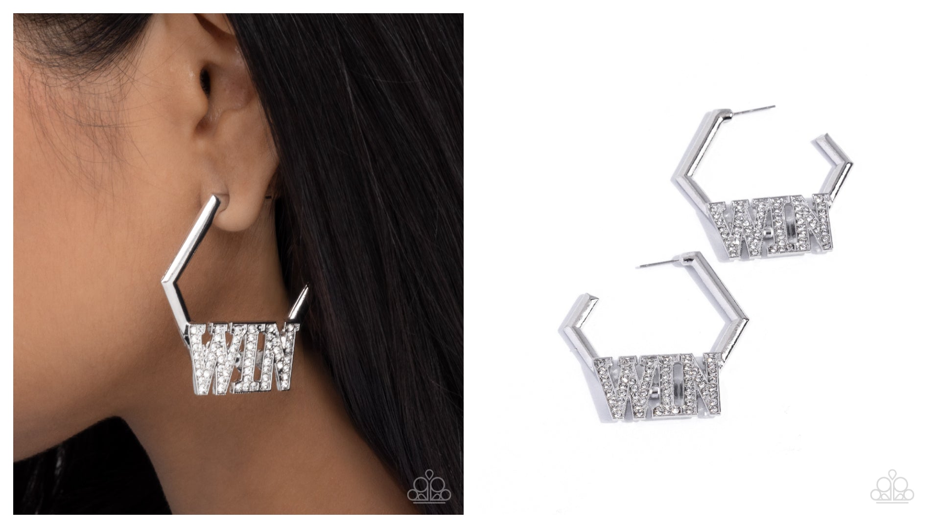 Dusted in glistening white rhinestones, the silver word "WIN" in a blocky serif font perches atop the center of a silver hexagonal hoop for a sporty-chic display. Earring attaches to a standard post fitting. Hoop measures approximately 1 3/4" in diameter.
