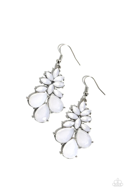 A collection of opalescent white teardrop and marquise cut glassy beads coalesce into a glamorous lure, resulting in a mystical pop of color. Earring attaches to a standard fishhook fitting.