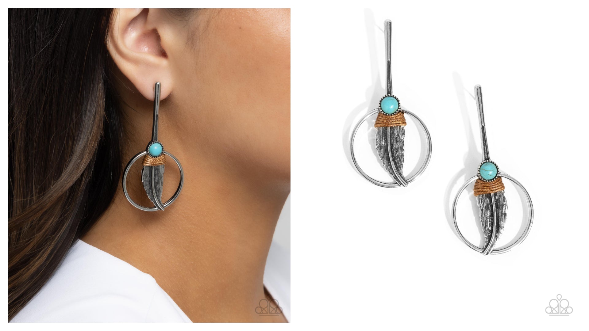 Pressed in a studded silver frame, a turquoise stone gives way to a textured silver feather, suspended along the center of a glistening silver hoop from an elongated silver fitting for a free-spirited lure. Rows of brown twine are wrapped along the base of the feather, meeting the turquoise stone for additional rustic detail. Earring attaches to a standard post fitting. As the stone elements in this piece are natural, some color variation is normal.