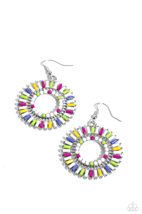 Featuring bright white, Kohlrabi, High Visibility, Rose Violet, and Persian Jewel colors, round beads adorn the inner circle of a whimsical silver studded frame, while emerald-cut beads in the same shades encrust along the outer curve of the hoop for a spinning display of color. Earring attaches to a standard fishhook fitting.